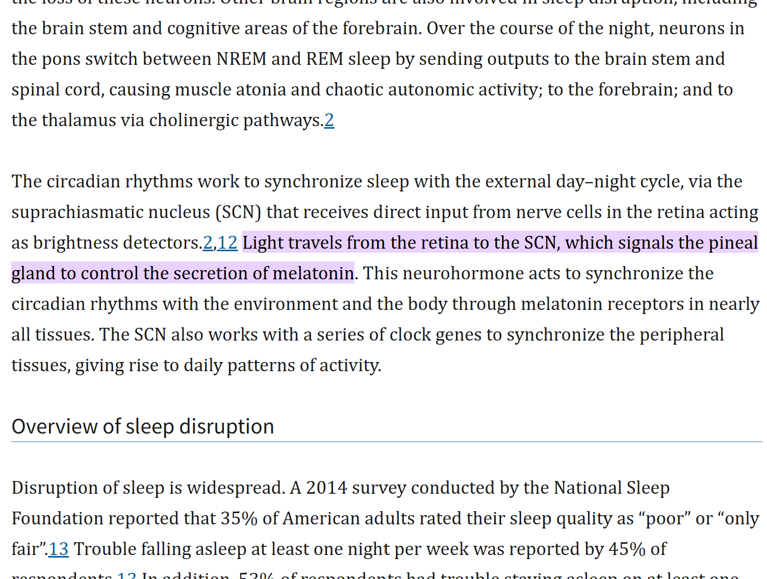 수면을 관장하는 핵심 호르몬인 멜라토닌(Melatonin)은 단독으로 생성되지 않는다. 멜라토닌은 낮 동안 분비된 세로토닌(Serotonin)이 밤이 되어 빛이 차단되면 효소 반응(AANAT, HIOMT)을 거쳐 변환되는 물질이다. 즉, 세로토닌이 충분하지 않으면 멜라토닌 또한 생성될 수 없다.