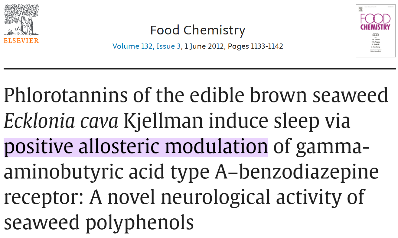 - 디엑콜(Dieckol)의 작용: 감태의 핵심 성분인 해양 폴리페놀(Phlorotannins), 특히 디엑콜은 벤조디아제핀 계열 수면제와 유사하게 GABA-A 수용체의 벤조디아제핀 결합 부위에 작용한다. 그러나 화학 약물과 달리 의존성이나 내성, 근육 이완 부작용 없이 자연스럽게 수면을 유도하고 유지시킨다.